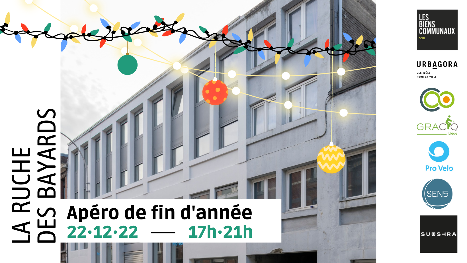 La coopérative Les Biens Communaux, l’asbl urbAgora, ProVélo Liège, la locale du GRACQ Liège, le bureau d’études SEN5 et la coopérative Cooperlic ont donc le plaisir de vous inviter à un apéro de fin d’année pour fêter leur emménagement. Vous aurez ainsi l’occasion de découvrir ces nouveaux lieux.