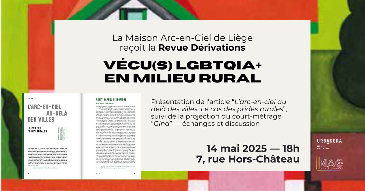 Le 14 mai prochain, la Maison Arc-en-Ciel de Liège reçoit la Revue 𝘋𝘦́𝘳𝘪𝘷𝘢𝘵𝘪𝘰𝘯𝘴 dans le cadre de sa campagne de communication du dernier numéro paru, « Ce que l’urbain fait au rural » qui entend questionner le « regard urbain » sur les espaces ruraux.