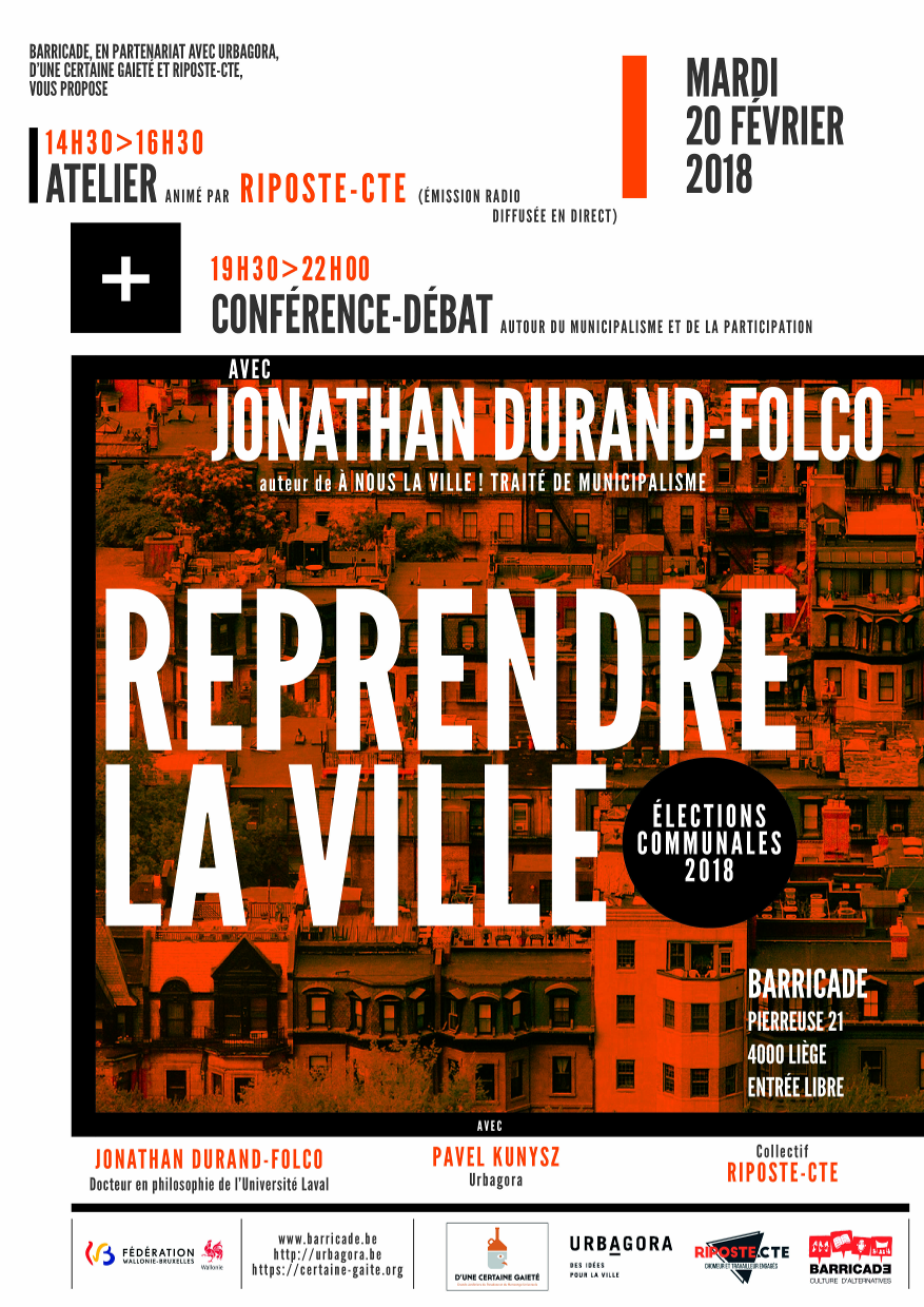 C’est la question du lien entre luttes municipales et luttes autour du travail qui sera plus spécifiquement traitée, dans un atelier animé par le collectif liégeois de défense du droit au chômage Riposte-Cte. Cet atelier prendra la forme d’une émission radio en public diffusée en direct à cette adresse :