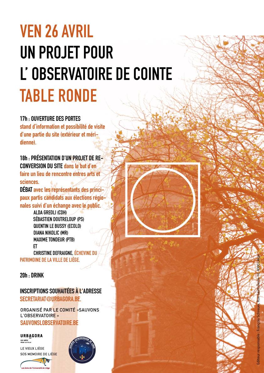 Le comité Sauvons l’Observatoire de Liège, qui réunit la Société Astronomique de Liège, Le Vieux Liège, SOS Mémoire de Liège, urbAgora ainsi que plusieurs personnalités liégeoises, organise, le vendredi 26 avril, une table ronde sur l’avenir du site de l’Observatoire de Liège.