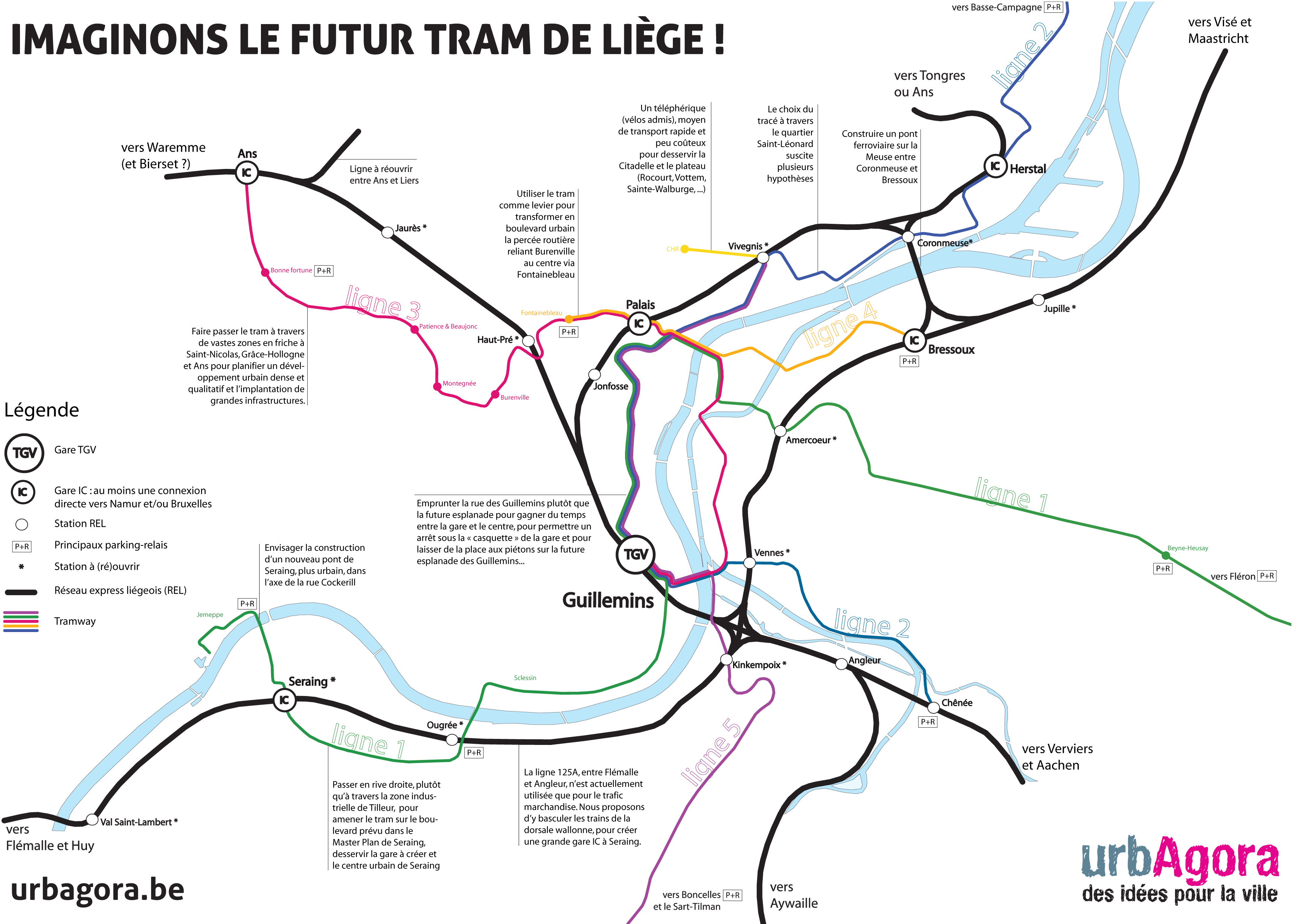 Ce projet radical appelle de notre part quelques commentaires. À commencer par souligne les points de convergence avec la proposition d’urbAgora, notamment au niveau du tracé : Pierre Arnould, comme nous, souligne la nécessité d’un réseau maillé, plaide pour le passage du transport en commun structurant en rive droite de la Meuse tandis que son schéma ressemble fortement, du moins du point de vue des voiries qu’ils empruntent, à celui de la première phase que nous proposons. Les poins de divergence sont cependant nombreux et concernent principalement le domaine de l’exploitation du réseau.