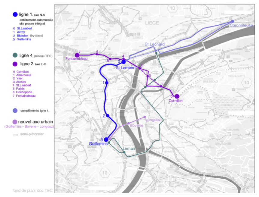 La presse liégeoise a rendu compte, la semaine dernière |1|, du projet de métro |2| aérien automatisé proposé par Pierre Arnould. L’élément principal de cette proposition consiste en un tronçon de transport en commun automatisé reliant les Guillemins à la place Saint-Lambert, circulant sur une voie unique en hauteur (laissant quatre mètres entre le sol et l’infrastructure) et doté de deux arrêts intermédiaires (Pont d’Avroy et Blonden) qui sont aussi les points où se croisent les véhicules (ce type d’exploitation, très exigeante, étant rendue possible par la grande précision horaire d’un système automatisé). À ce tronçon principal s’ajoute la proposition d’une ligne de tram reliant Fontainebleau à Cornillon. L’actuelle ligne 4 (qui pourrait également, dans ce schéma, être convertie en tram) se voit amputée de son segment central et relie les Guillemins à la place des Déportés, via le Longdoz et Outremeuse, mais sans passer par le centre (figure 1).