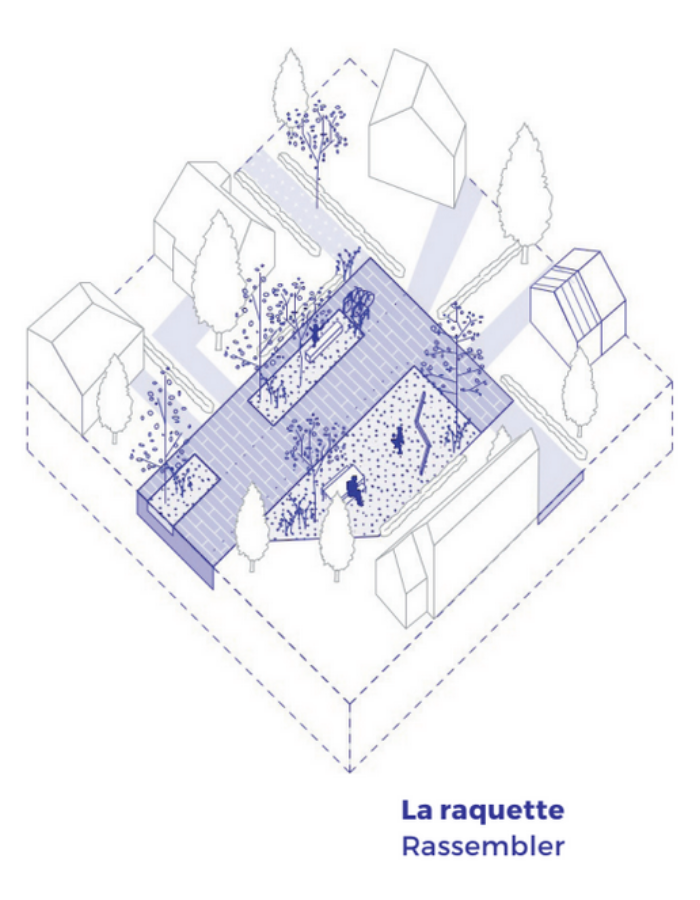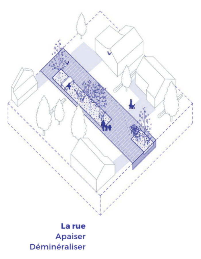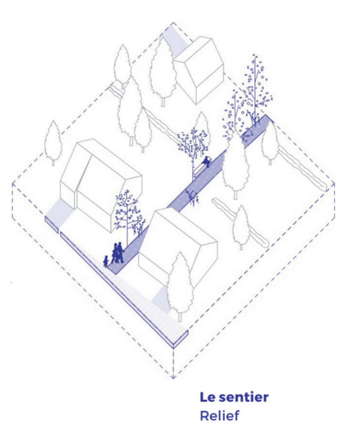 12h30. Jérémie aperçoit Yaëlle rentrer au bout de l’allée commune. Depuis cette rentrée scolaire, elle va à pied ou à vélo à l’école * quel bonheur de ne plus devoir faire les trajets ! Il y a un tracé pedibus, qui profite du réseau de sentiers qui a été reconstruit ces dernières années. Il permet de relier les cul-de-sac et passe entre les clos et les jardins. D’un coup, les maisons de ses ami·e·s qui semblaient si loin sont tout près, au fond du jardin ou de l’autre côté de la haie. C’est dingue. Puis les adultes eux aussi circulent beaucoup plus à pied maintenant. Fini la voiture pour aller au Delitraiteur ou n’importe où. La perception des distances a changé.